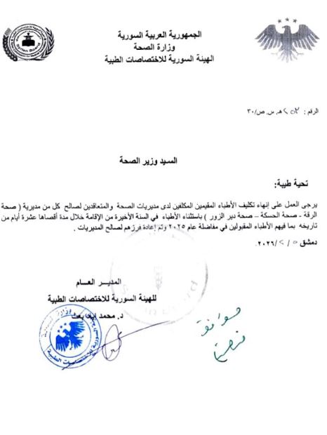 في إطار تحسين الواقع الصحي في مناطق الجزيرة (دير الزور والرقة والحسكة)، اتخذت وزارة الصحة بالتنسيق مع الهيئة السورية للاختصاصات الطبية، قراراً يقضي بإنهاء تكليف الأطباء المقيمين والمتعاقدين التابعين لمديريات صحة تلك المحافظات، والعاملين خارج نطاقها الجغرافي.