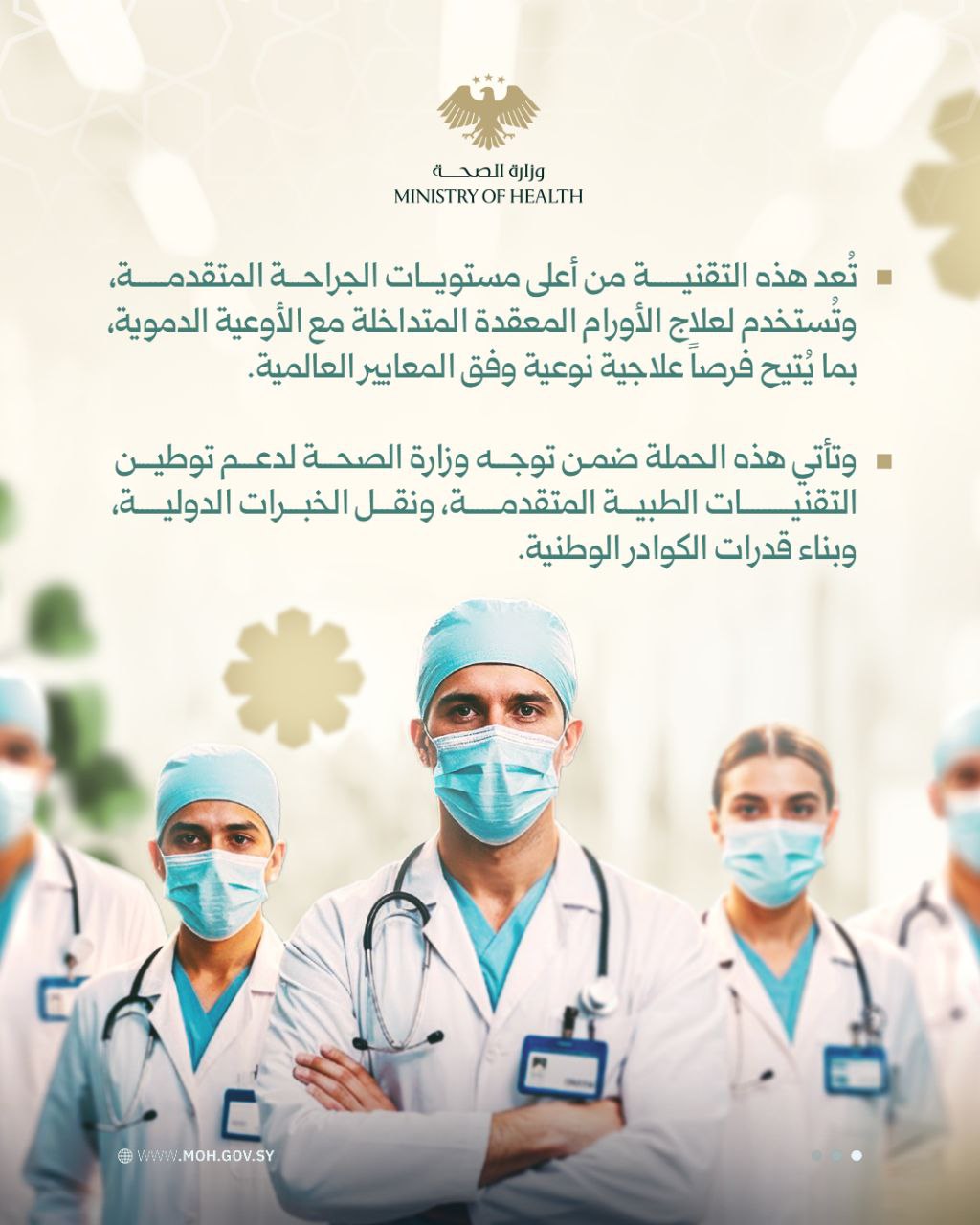 برعاية وزارة الصحة وبالتعاون مع التجمع السوري في ألمانيا (برنامج شفاء 2026)، إطلاق حملة جراحية نوعية لعلاج الأورام المعقدة والمتداخلة مع الأوعية الدموية، في مشفى البيروني بدمشق.